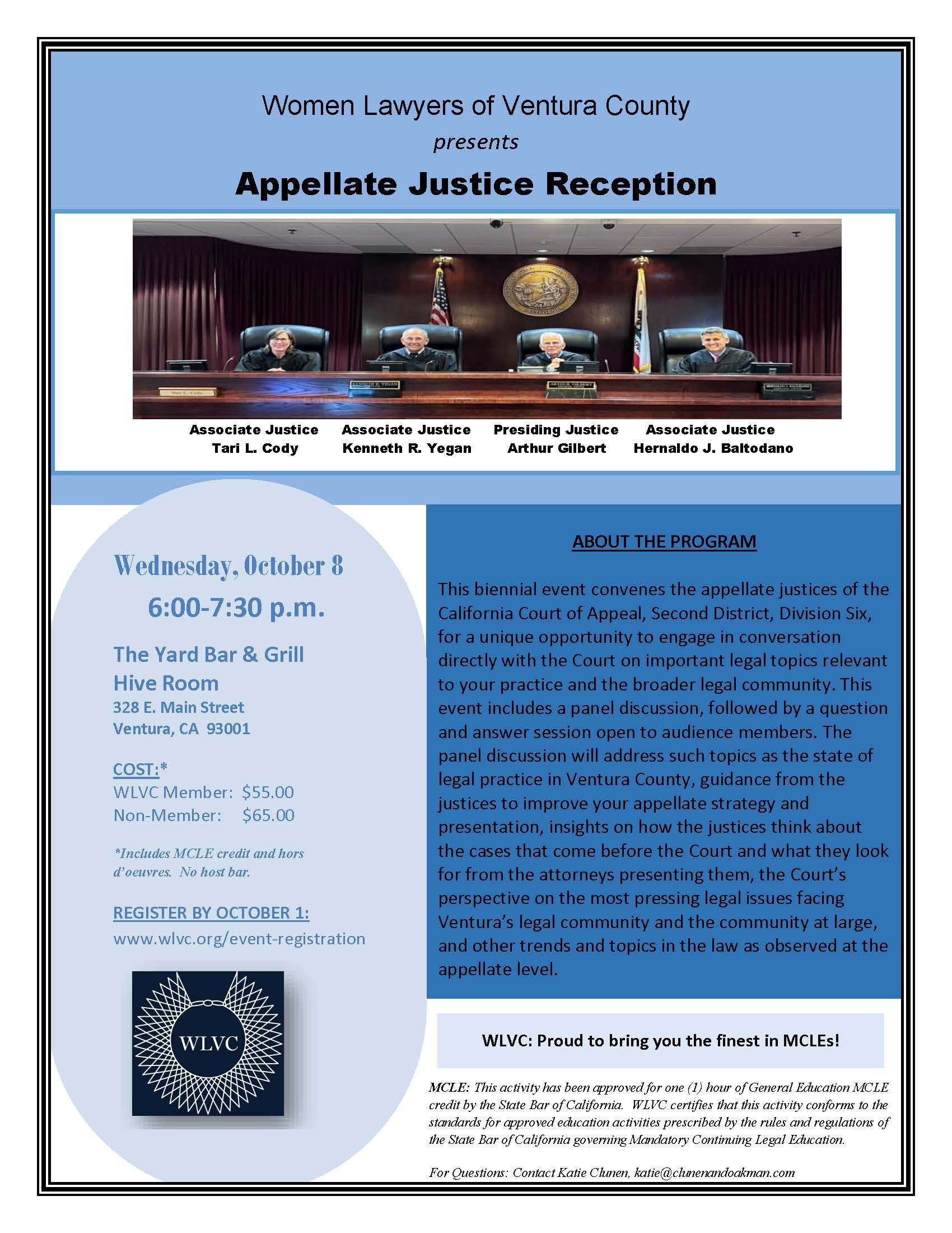 This biennial event convenes the appellate justices of the California Court of Appeal, Second District, Division Six, for a unique opportunity to engage in conversation directly with the Court on important legal topics relevant to your practice and the broader legal community. This event includes a panel discussion, followed by a question and answer session open to audience members. The panel discussion will address such topics as the state of legal practice in Ventura County, guidance from the justices to improve your appellate strategy and presentation, insights on how the justices think about the cases that come before the Court and what they look for from the attorneys presenting them, the Court’s perspective on the most pressing legal issues facing Ventura’s legal community and the community at large, and other trends and topics in the law as observed at the appellate level.